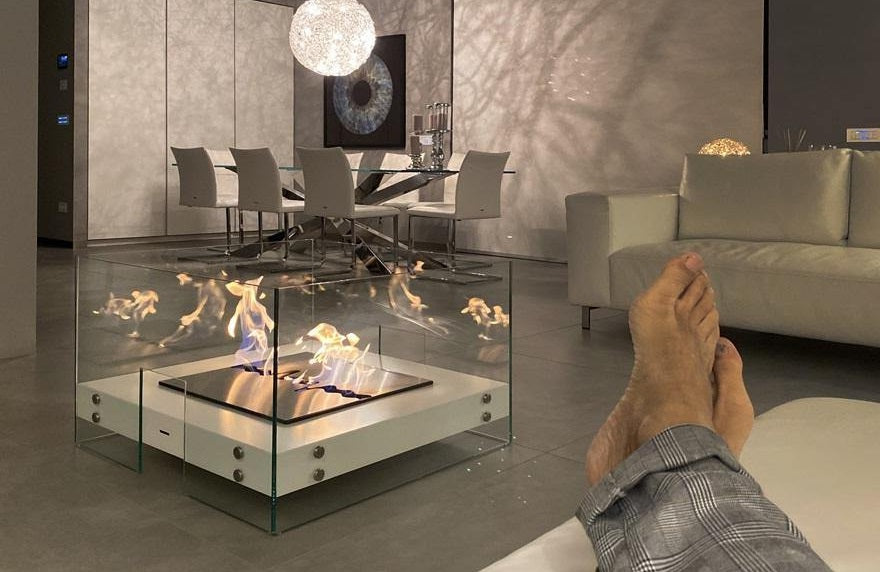 Del Teide White Detached Garden Biofireplace ocean of fire ”. Great visual effects achieved through a heavy commitment to biofuel with an irregular wave-shaped fire line and large panes of tempered glass.