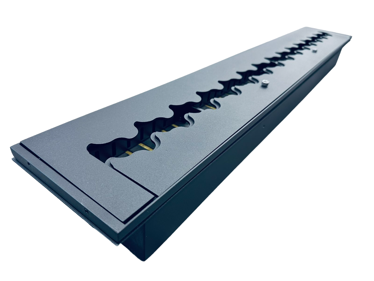 Nederlandse productie bio ethanol inbouwbrander met ZIAGZAG PRO uitsparing van WILD FLAME, constructie van 1,5 mm dik ketelstaal, gelakt met hittebestendige verf in een kleur vergelijkbaar met zwart, boven deksel van de brander van 6 mm dik staal. De brander maakt gebruik van een keramisch absorberend inzetstuk (veilige bio-inzet), die voorkomt dat de biobrandstof naar buiten loopt bij een sterke impact of het omvallen van de bio ethanolhaard. Tegelijkertijd verbrandt de biobrandstof gelijkmatiger. De absorberende wol is donker van kleur, dus het contrasteert niet met de brander, zoals bij witte cartridges het geval is. Brander voor individuele installatie - opstelling.