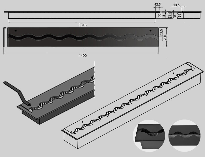 Een moderne inzetbrander voor een inbouwhaard met een karakteristieke, innovatieve golfvormige WAVE vuurlijn geproduceerd door KAMI, die de vlam dynamischer en ruimtelijker maakt. Het bio ethanol brander inzetstuk voor de inbouwhaard is gemaakt van hoogwaardig 1,5 mm dik staal, gepoedercoat met een hittebestendige zwarte semi-matte lak. Het deksel van het inzetstuk bestaat uit twee delen - het is een nauwkeurig laser gesneden element van plaatstaal met een dikte van 5 mm, ook beschermd met dezelfde hittebestendige verf als het frame. Hierdoor is het onderdeel dat het meest opwarmt door vuur beschermd tegen eventuele vervormingen en behoudt het volledig zijn oorspronkelijke vorm. De perfecte pasvorm van de rand van het deksel garandeert een nauwkeurige regeling van de grootte vlammen en een snelle en gemakkelijke blussing.